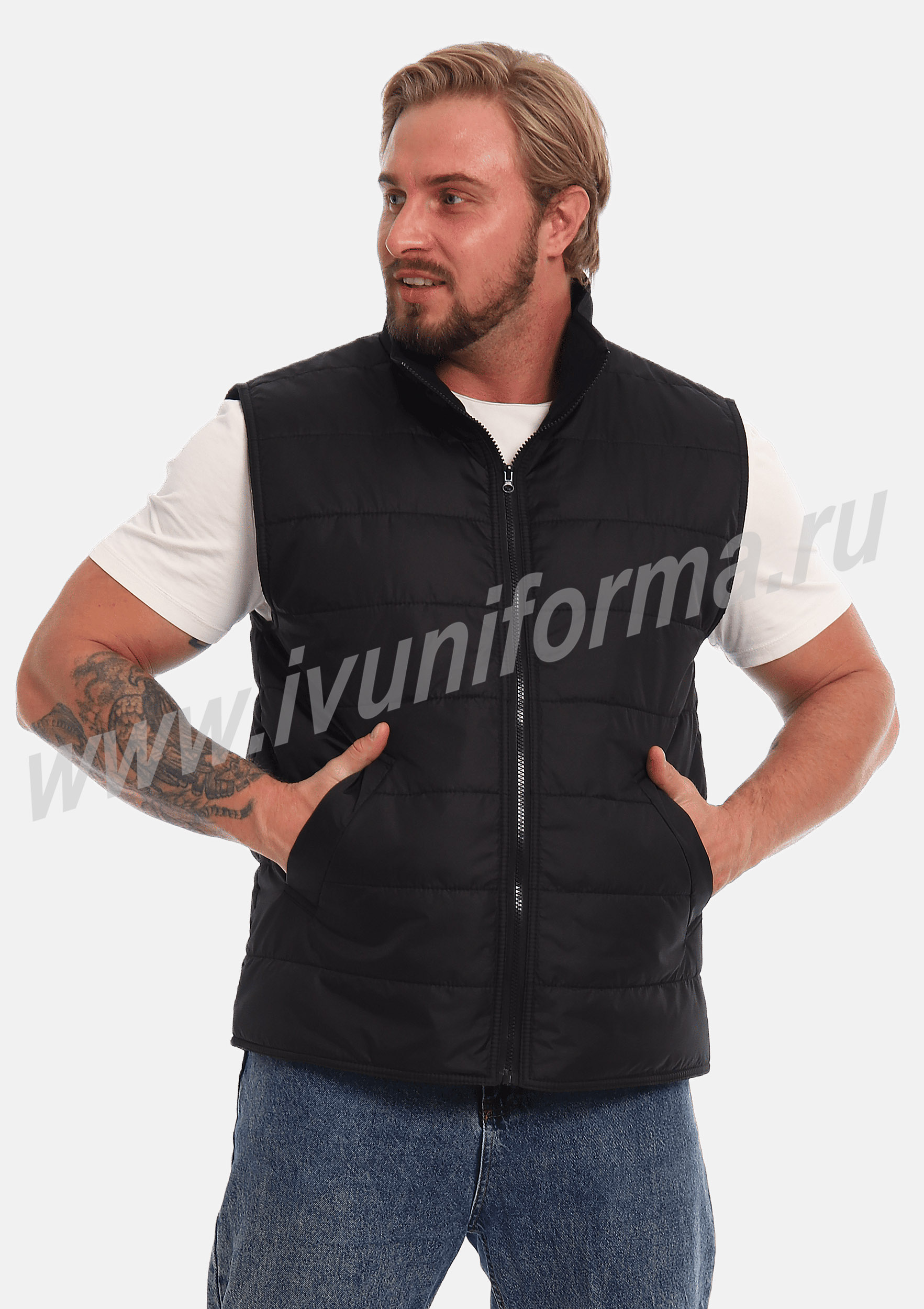 Жилет утепленный на молнии с двумя боковыми карманами в нижней части. Внутренняя часть жилета выполнена из ткани флис. В качестве утеплителя используется синтепон. Жилет является универсальным для использования как мужчинам, так и женщинам.