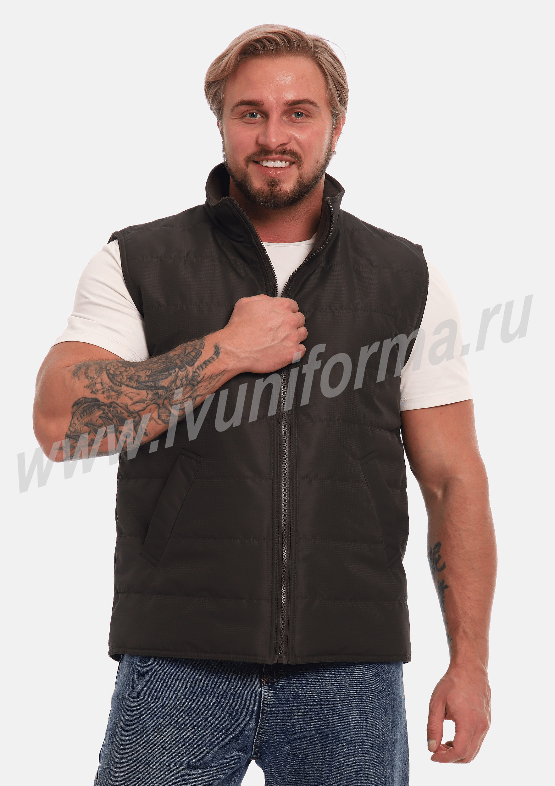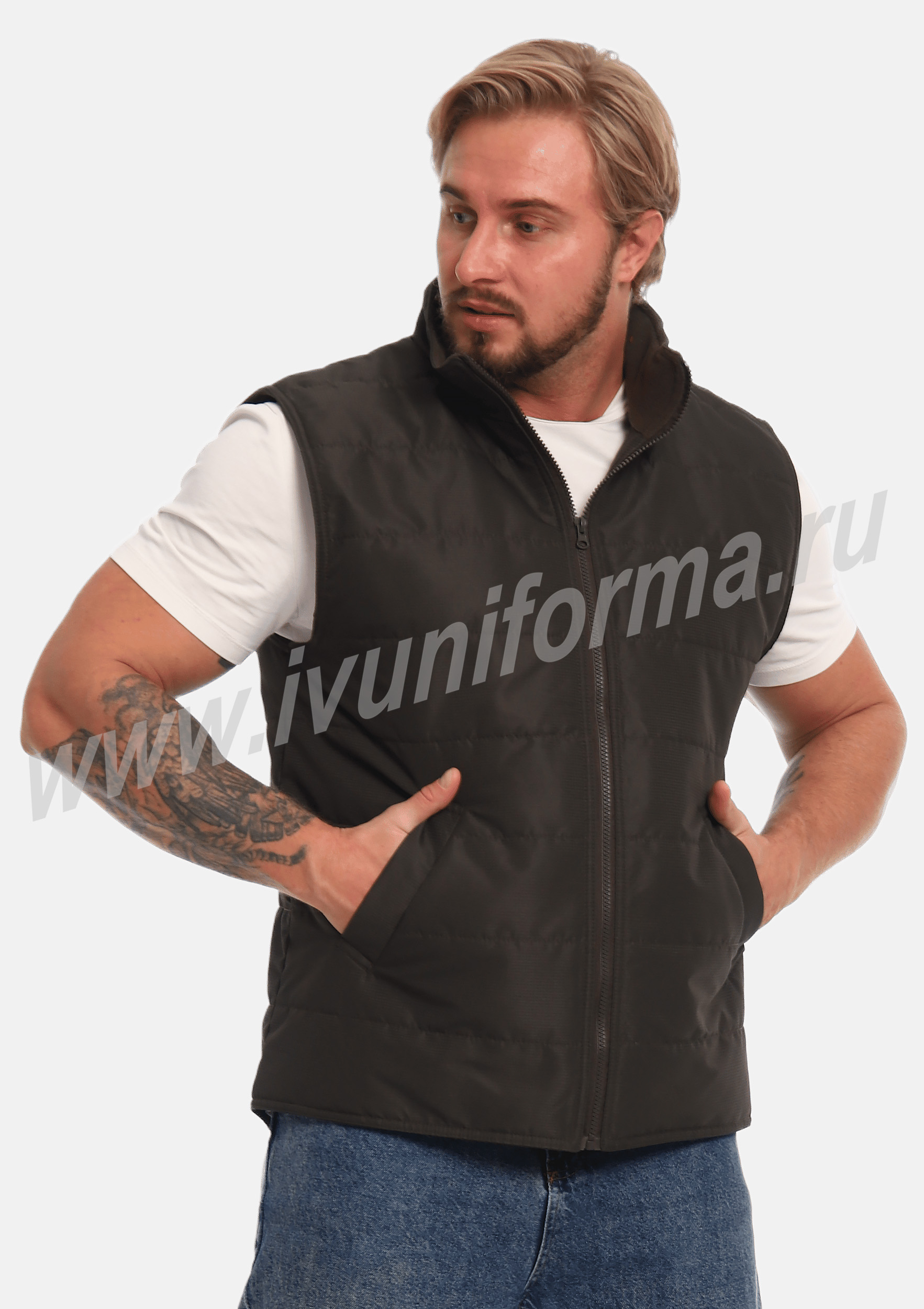 Жилет утепленный на молнии с двумя боковыми карманами в нижней части. Внутренняя часть жилета выполнена из ткани флис. В качестве утеплителя используется синтепон. Жилет является универсальным для использования как мужчинам, так и женщинам.